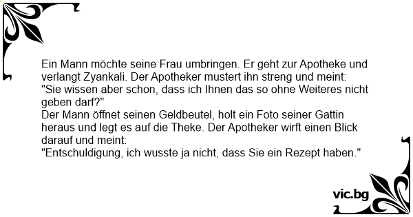 Ein Mann, der seine Frau umbringen will, geht in die Apotheke und verlangt Zyankali. Der Apotheker: "Tut mir leid, ich kann ihnen das nicht einfach so rausgeben." Der Mann holt ein Bild von seiner...