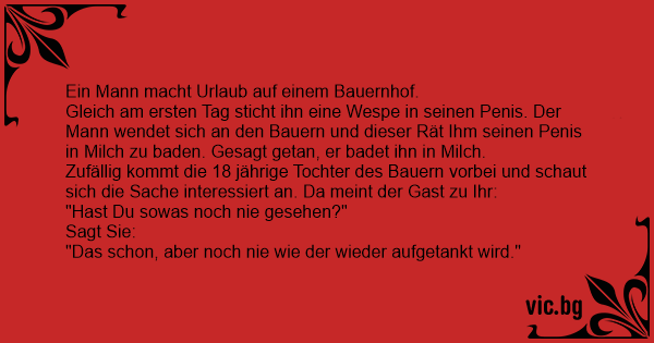Gleich am ersten Tag sticht ihn eine Wespe in seinen Реnis. Der Mann wendet sich an den Bauern und dieser Rät Ihm seinen Реnis in Milch zu baden. Gesagt getan, er badet ihn in Milch.