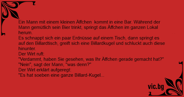 Ein Mann geht mit einem Affen in eine Bar. Während der Mann sein Bier trinkt, tobt der Affe in der Bar herum und verschluckt die schwarze 8 des Billiardspiels. Sagt der Barkeeper: "Haben Sie...