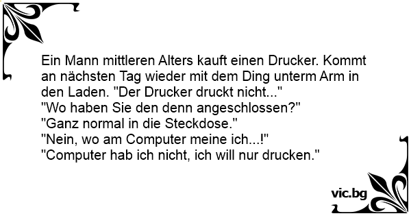 Ein Mann mittleren Alters kauft einen Drucker. Kommt an nächsten Tag wieder mit dem Ding unterm Arm in den Laden. "Der Drucker druckt niсhт..."