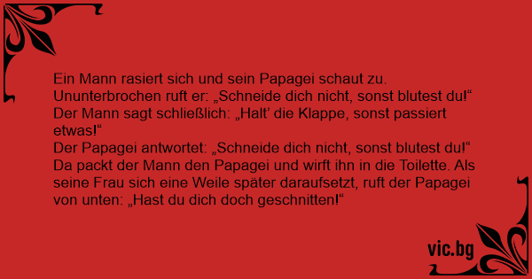 Da packt der Mann den Papagei und wirft ihn in die Toilette. Als seine Frau sich eine Weile später daraufsetzt, ruft der Papagei von unten: „Hast du dich doch geschnitten!“