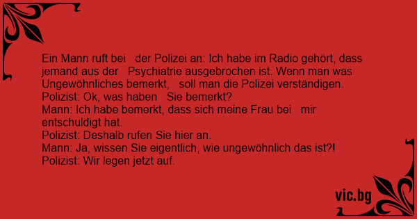 Ein Mann ruft bei der Polizei an: Ich habe im Radio gehört, dass jemand aus der Psychiatrie ausgebrochen ist. Wenn man was Ungewöhnliches bemerkt, soll man die Polizei verständigen. Polizist: Ok, was haben Sie bemerkt? Mann: Ich habe bemerkt, dass sich meine Frau bei mir entschuldigt hat. Polizist: Deshalb rufen Sie hier an. Mann: Ja, wissen Sie eigentlich, wie ungewöhnlich das ist?! Polizist: Wir legen jetzt auf.
