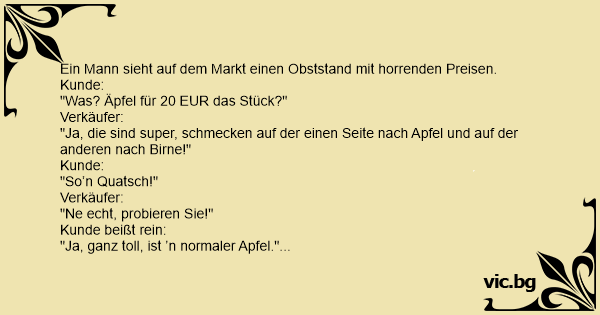 "Wow! Hammer! Schmeckt echt nach Birne! Und was sind das für Äpfel da oben für 30 EUR?"