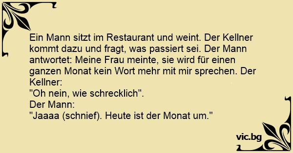 Ein Mann geht in eine Bar und setzt sich an die Theke. Fragt der Kellner: "Warum denn so traurig?" Sagt der Mann: "Meine Frau hat gesagt, sie will einen Monat lang nicht mit mir reden!" Sagt der Kellner: "Das ist doch nicht so schlimm. Diese Zeit geht auch vorbei." Antwortet der Mann: "Ja, heute!"