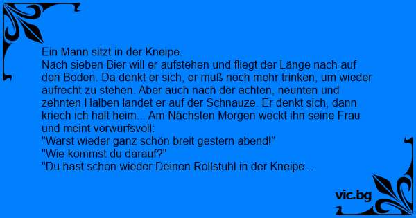 Nach sieben Bier will er aufstehen und fliegt der Länge nach auf den Boden. Da denkt er sich, er muß noch mehr trinken, um wieder aufrecht zu stehen. Aber auch nach der achten, neunten und zehnten Halben landet er auf der Schnauze. Er denkt sich, dann kriech ich halt heim... Am Nächsten Morgen weckt ihn seine Frau und meint vorwurfsvoll: