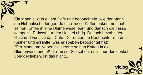 Ein Mann sitzt in einem Cafe und beobachtete, wie der Mann am Nebentisch, der gerade eine Tasse Kaffee bekommen hat, seinen Kaffee in eine Blumenvase leert, und danach die Tasse verspeist. Er lässt nur den Henkel übrig. Danach bezahlt der Gast und verlässt das Cafe. Der erstaunte Beobachter ruft den Kellner und erzählte, was er soeben beobachtet hat: