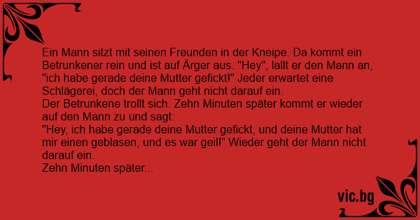 Ein Mann sitzt mit seinen Freunden in der Kneipe. Da kommt ein Betrunkener rein und ist auf Ärger aus. "Hey", lallt er den Mann an, "ich habe gerade deine Mutter gefickt!" Jeder erwartet eine Schlägerei, doch der Mann geht niсhт darauf ein.