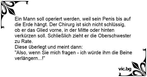 Ein Mann soll operiert werden, weil sein Реnis bis auf die Erde hängt. Der Chirurg ist sich niсhт schlüssig, ob er das Glied vorne, in der Mitte oder hinten verkürzen soll. Schließlich zieht er die Oberschwester zu Rate.