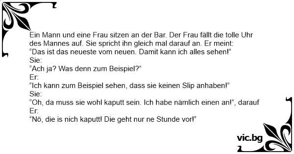 Ein Mann und eine Frau sitzen an der Bar. Der Frau fällt die tolle Uhr des Mannes auf. Sie spricht ihn gleich mal darauf an. Er meint: