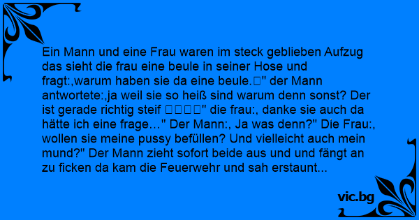 Ein Mann und eine Frau waren im steck geblieben Aufzug das sieht die frau eine beule in seiner Hose und fragt:,warum haben sie da eine beule.😅" der Mann antwortete:,ja weil sie so heiß sind warum denn sonst? Der ist gerade richtig steif 😏😏😏😏" die frau:, danke sie auch da hätte ich eine frage…" Der Mann:, Ja was denn?" Die Frau:, wollen sie meine рussy befüllen? Und vielleicht auch mein mund?" Der Mann zieht sofort beide aus und und fängt an zu fiскеn da kam die Feuerwehr und sah erstaunt und gingen wieder.😌😏😌😏😌