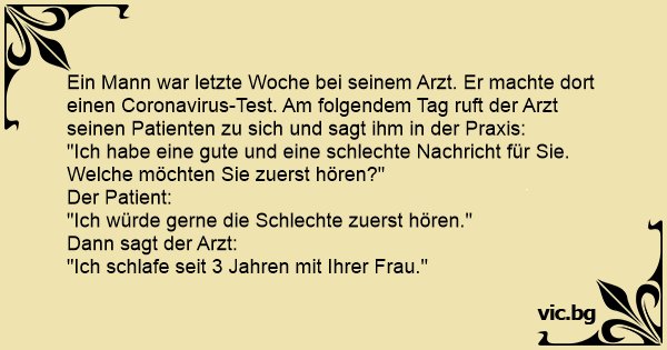 Ein Mann war letzte Woche bei seinem Arzt. Er machte dort einen Coronavirus-Test. Am folgendem Tag ruft der Arzt seinen Patienten zu sich und sagt ihm in der Praxis: