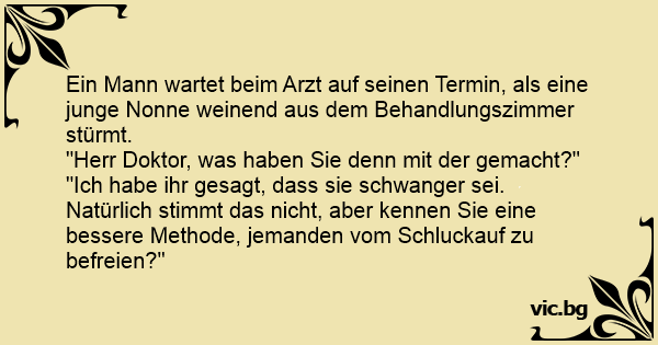 Auch Nonnen müssen manchmal zum Frauenarzt. Der Gynäkologe macht einen Scherz und sagt zu der Schwester Hildegard: „Liebe Schwester, ich sag’ es Ihnen ungern, aber Sie sind schwanger“. Die...