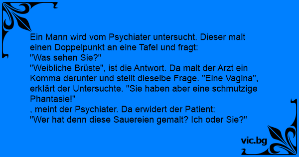 "Weibliche Brüste", ist die Antwort. Da malt der Arzt ein Komma darunter und stellt dieselbe Frage. "Eine Vаginа", erklärt der Untersuchte. "Sie haben aber eine schmutzige Phantasie!"
