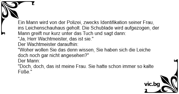 Ein Mann wird von der Polizei, zwecks Identifikation seiner Frau, ins Leichenschauhaus geholt. Die Schublade wird aufgezogen, der Mann greift nur kurz unter das Tuch und sagt dann: