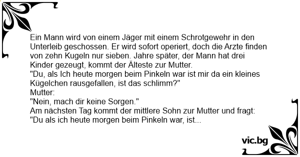 Ein Mann wird von einem Jäger mit einem Schrotgewehr in den Unterleib geschossen. Er wird sofort operiert, doch die Arzte finden von zehn Kugeln nur sieben. Jahre später, der Mann hat drei Kinder gezeugt, kommt der Älteste zur Mutter.