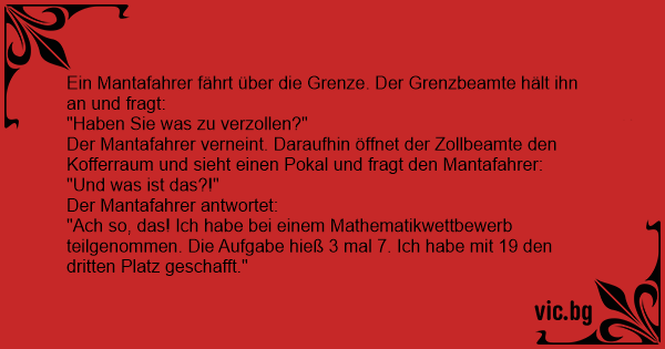"Ach so, das! Ich habe bei einem Mathematikwettbewerb teilgenommen. Die Aufgabe hieß 3 mal 7. Ich habe mit 19 den dritten Platz geschafft."