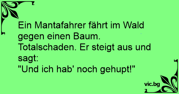 Ein Mantafahrer fährt im Wald gegen einen Baum. Totalschaden. Er steigt aus und sagt: