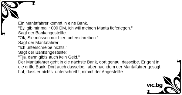 Der Mantafahrer geht in die nächste Bank, dort genau dasselbe. Er geht in die dritte Bank. Dort auch dasselbe, aber nachdem der Mantafahrer gesagt hat, dass er nichts unterschreibt, nimmt der Angestellte dessen Kopf und haut ihn mehrmals auf die Tischkante. Da sagt der Mantafahrer: