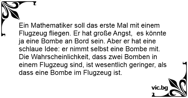 Was macht ein Mathematiker, der vor dem Fliegen Angst hat, dass eine Bombe im Flugzeug ist? Er nimmt eine eigene Bombe mit, da die statistische Wahrscheinlichkeit, dass sich in einem Flugzeug zwei...
