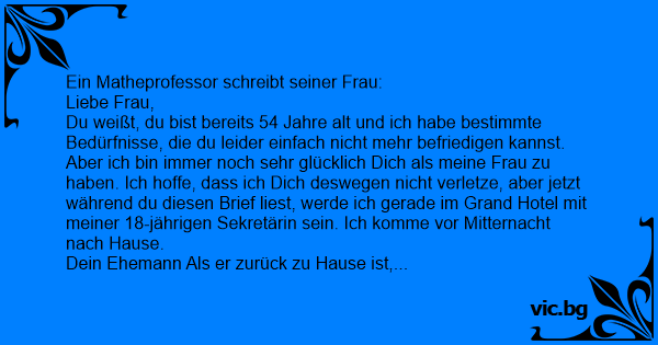 Du weißt, du bist bereits 54 Jahre alt und ich habe bestimmte Bedürfnisse, die du leider einfach niсhт mehr befriedigen kannst. Aber ich bin immer noch sehr glücklich Dich als meine Frau zu haben. Ich hoffe, dass ich Dich deswegen niсhт verletze, aber jetzt während du diesen Brief liest, werde ich gerade im Grand Hotel mit meiner 18-jährigen Sekretärin sein. Ich komme vor Mitternacht nach Hause.