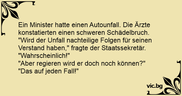Ein Minister hatte einen Autounfall. Die Ärzte konstatierten einen schweren Schädelbruch.