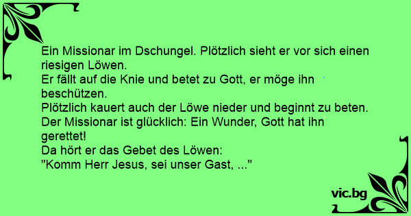 Ein Missionar wird in Afrika von Löwen umkreist, die ihn fressen wollen. Er kniet nieder und betet: "Lieber Gott, bitte wirke ein Wunder und mache aus diesen Tieren gläubige Christen!" Da knien die Löwen auch im Kreis um ihn nieder und beginnen zu beten: "Komm‘ Herr Jesus sei unser Gast und...