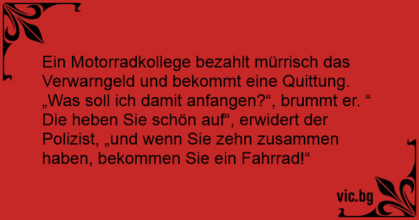 Ein Motorradkollege bezahlt mürrisch das Verwarngeld und bekommt eine Quittung. „Was soll ich damit anfangen?“, brummt er. “ Die heben Sie schön auf“, erwidert der Polizist, „und wenn Sie zehn zusammen haben, bekommen Sie ein Fahrrad!“