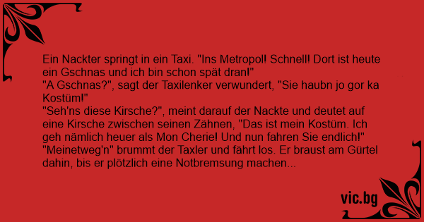 "Seh'ns diese Kirsche?", meint darauf der Nackte und deutet auf eine Kirsche zwischen seinen Zähnen, "Das ist mein Kostüm. Ich geh nämlich heuer als Mon Cherie! Und nun fahren Sie endlich!"