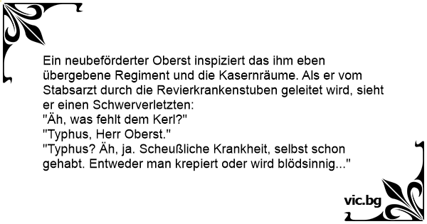 "Typhus? Äh, ja. Scheußliche Krankheit, selbst schon gehabt. Entweder man krepiert oder wird blödsinnig..."