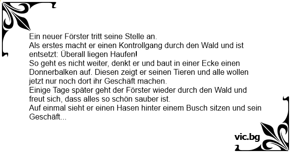 Auf einmal sieht er einen Hasen hinter einem Busch sitzen und sein Geschäft erledigen! Der Förster geht sofort hin und fragt den Hasen, warum er denn niсhт auf den Donnerbalken geht.