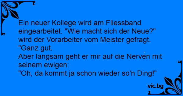 Ein neuer Kollege wird am Fliessband eingearbeitet. "Wie macht sich der Neue?" wird der Vorarbeiter vom Meister gefragt. "Ganz gut.