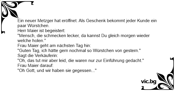 Ein neuer Metzger hat eröffnet. Als Geschenk bekommt jeder Kunde ein paar Würstchen.