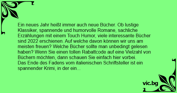 Ein neues Jahr heißt immer auch neue Bücher. Ob lustige Klassiker, spannende und humorvolle Romane, sachliche Erzählungen mit einem Touch Humor, viele interessante Bücher sind 2022 erschienen. Auf welche davon können wir uns am meisten freuen? Welche Bücher sollte man unbedingt gelesen haben? Wenn Sie einen tollen Rabattcode auf eine Vielzahl von Büchern möchten, dann schauen Sie einfach hier vorbei.