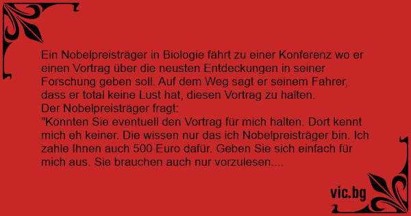 "Könnten Sie eventuell den Vortrag für mich halten. Dort kennt mich eh keiner. Die wissen nur das ich Nobelpreisträger bin. Ich zahle Ihnen auch 500 Euro dafür. Geben Sie sich einfach für mich aus. Sie brauchen auch nur vorzulesen.