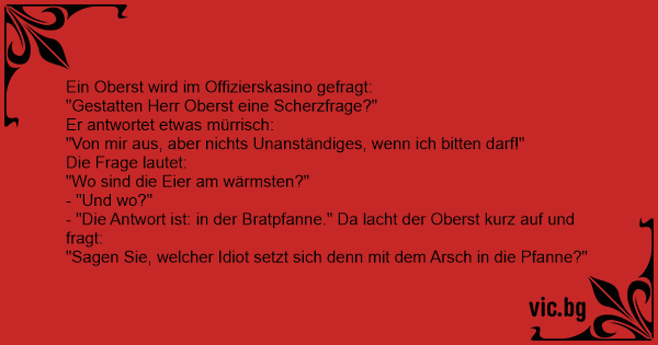 - "Die Antwort ist: in der Bratpfanne." Da lacht der Oberst kurz auf und fragt: