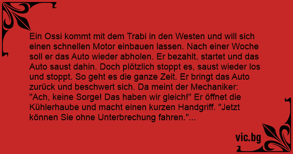 Ein Ossi kommt mit dem Trabi in den Westen und will sich einen schnellen Motor einbauen lassen. Nach einer Woche soll er das Auto wieder abholen. Er bezahlt, startet und das Auto saust dahin. Doch plötzlich stoppt es, saust wieder los und stoppt. So geht es die ganze Zeit. Er bringt das Auto zurück und beschwert sich. Da meint der Mechaniker: