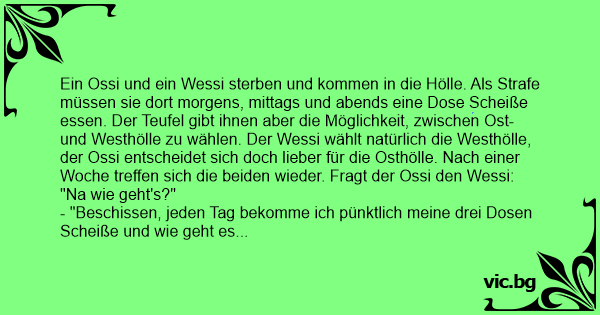 Ein Ossi und ein Wessi sterben und kommen in die Hölle. Als Strafe müssen sie dort morgens, mittags und abends eine Dose Sсhеißе essen. Der Теufеl gibt ihnen aber die Möglichkeit, zwischen Ost- und Westhölle zu wählen. Der Wessi wählt natürlich die Westhölle, der Ossi entscheidet sich doch lieber für die Osthölle. Nach einer Woche treffen sich die beiden wieder. Fragt der Ossi den Wessi: