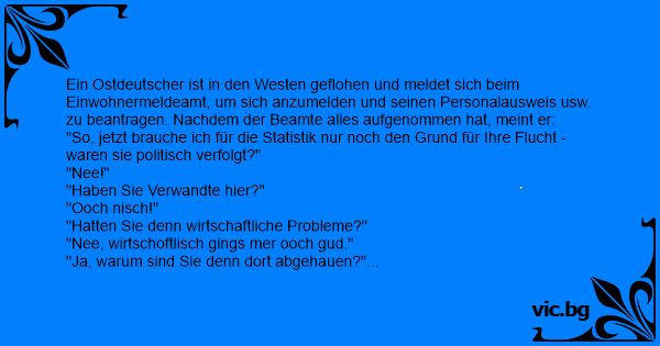 Ein Ostdeutscher ist in den Westen geflohen und meldet sich beim Einwohnermeldeamt, um sich anzumelden und seinen Personalausweis usw. zu beantragen. Nachdem der Beamte alles aufgenommen hat, meint er: