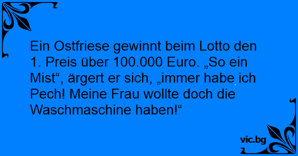 Ein Ostfriese gewinnt beim Lotto den 1. Preis über 100.000 Euro. „So ein Мisт“, ärgert er sich, „immer habe ich Pech! Meine Frau wollte doch die Waschmaschine haben!“