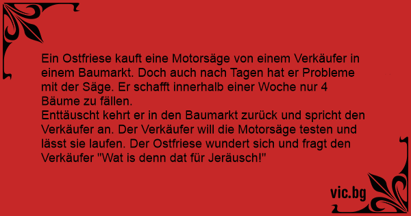 Enttäuscht kehrt er in den Baumarkt zurück und spricht den Verkäufer an. Der Verkäufer will die Motorsäge testen und lässt sie laufen. Der Ostfriese wundert sich und fragt den Verkäufer "Wat is denn dat für Jeräusch!"