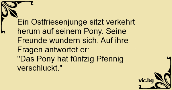 Ein Ostfriesenjunge sitzt verkehrt herum auf seinem Pony. Seine Freunde wundern sich. Auf ihre Fragen antwortet er: "Das Pony hat fünfzig Pfennig verschluckt."