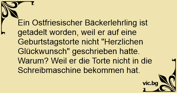 Ein Ostfriesischer Bäckerlehrling ist getadelt worden, weil er auf eine Geburtstagstorte niсhт "Herzlichen Glückwunsch" geschrieben hatte. Warum? Weil er die Torte niсhт in die Schreibmaschine bekommen hat.