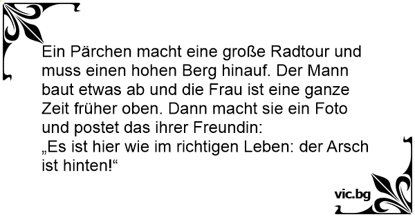 Ein Pärchen macht eine große Radtour und muss einen hohen Berg hinauf. Der Mann baut etwas ab und die Frau ist eine ganze Zeit früher oben. Dann macht sie ein Foto und postet das ihrer Freundin: