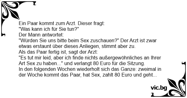 Der Arzt fragt: "Was kann ich für Sie tun? Der Mann antwortet: "Würden sie uns beim Sex zuschauen?" Der Arzt schaut etwas verdattert aber er stimmt zu. Als das Ehepaar "fertig" ist, sagt der Therapeut: "Es ist nichts aussergewöhnliches bei ihrer Art Sex zu haben", und verlangt 50 Euro für die...