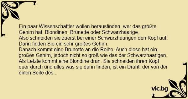 Ein paar Wissenschaftler wollen herausfinden, wer das größte Gehirn hat. Blondinen, Brünette oder Schwarzhaarige.