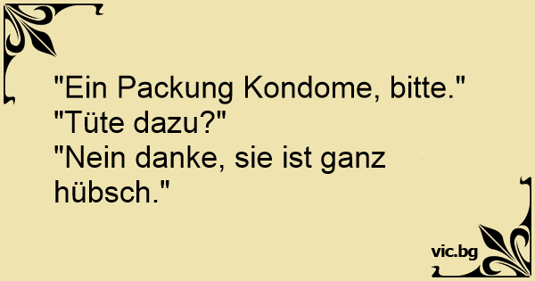 Geht ein Mann in einen Laden und kauft eine Packung Kondome. Da fragt die Kassiererin: „Brauchen Sie noch eine Tüte dazu?“ Darauf der Mann: „Nein danke, so hässlich ist sie nicht!“