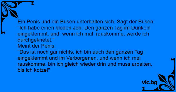 Ein Реnis und ein Busen unterhalten sich. Sagt der Busen: "Ich habe einen blöden Job. Den ganzen Tag im Dunkeln eingeklemmt, und wenn ich mal rauskomme, werde ich durchgeknetet." Meint der Реnis: "Das ist noch gar nichts, ich bin auch den ganzen Tag eingeklemmt und im Verborgenen, und wenn ich mal rauskomme, bin ich gleich wieder drin und muss arbeiten, bis ich kotze!"