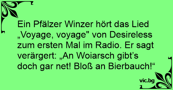 Ein Pfälzer Winzer hört das Lied „Voyage, voyage" von Desireless zum ersten Mal im Radio. Er sagt verärgert: „An Woiarsch gibt’s doch gar net! Bloß an Bierbauch!“