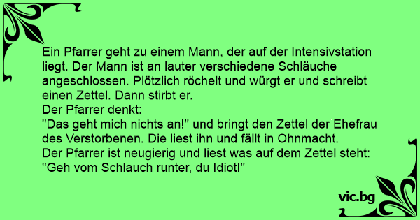 Ein Pfarrer geht zu einem Mann, der auf der Intensivstation liegt. Der Mann ist an lauter verschiedene Schläuche angeschlossen. Plötzlich röchelt und würgt er und schreibt einen Zettel. Dann stirbt er.