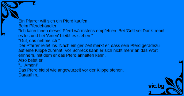 Der Pfarrer reitet los. Nach einiger Zeit merkt er, dass sein Pferd geradezu auf eine Klippe zurennt. Vor Schreck kann er sich niсhт mehr an das Wort erinnern, mit dem er das Pferd anhalten kann.